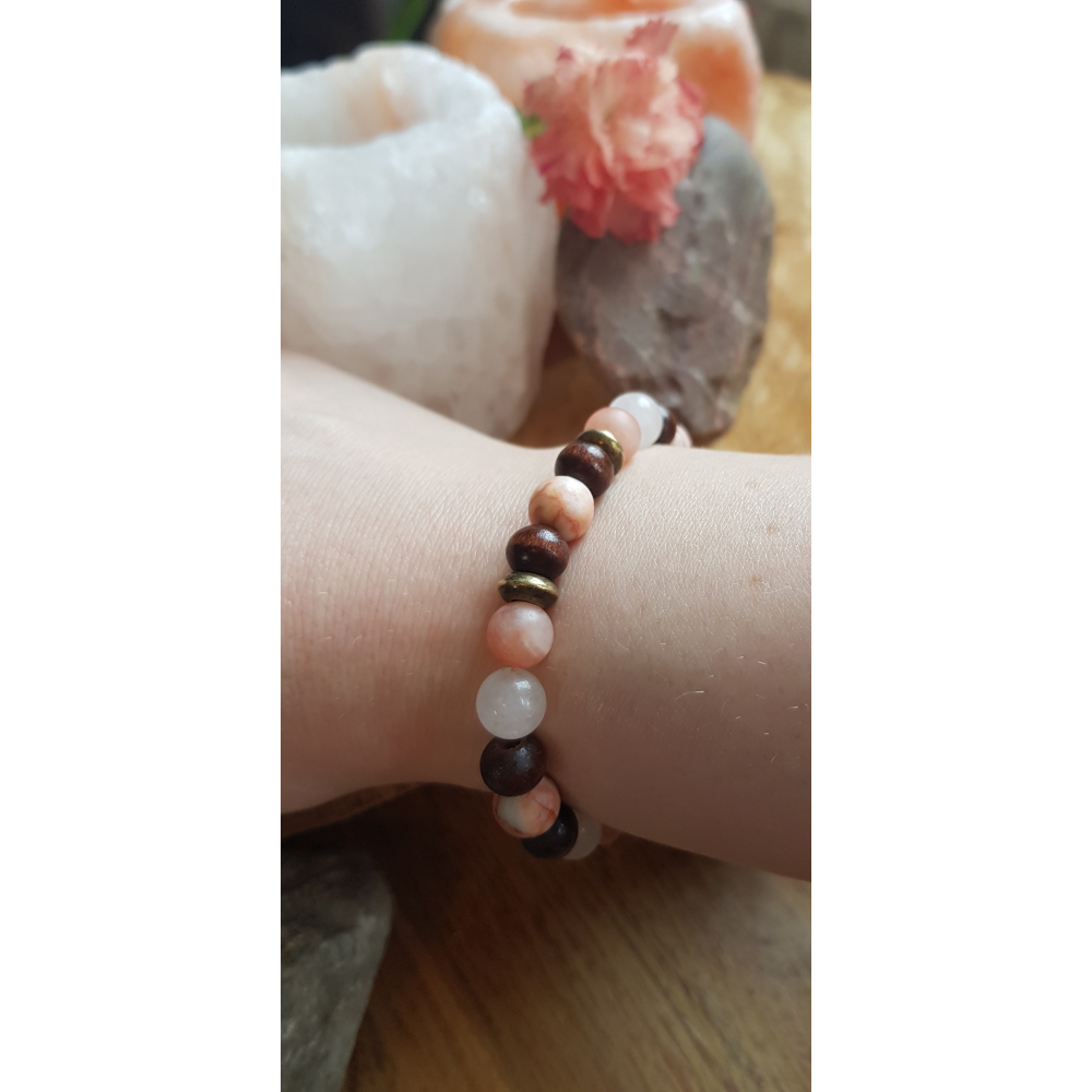 Deze prachtige edelsteen armband bestaat uit houten kralen en de volgende edelstenen: