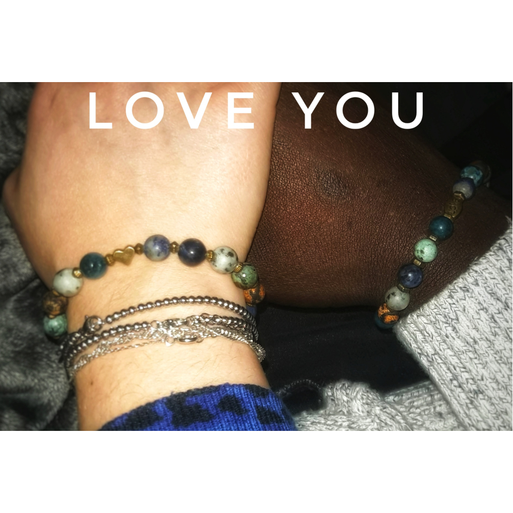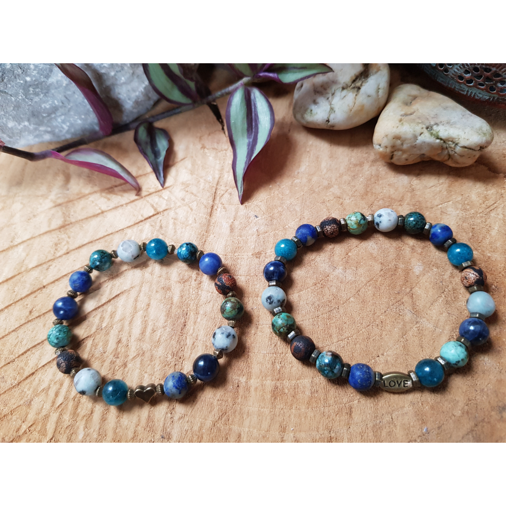 Deze prachtige koppel armbanden (armbanden voor hem en haar) set bestaat uit de edelstenen: agaat, lapis lazuli, turkoois, sodaliet, apatiet, jasper en azuriet. Deze prachtige liefdesarmbandenset is speciaal ontworpen voor een klant en is (met toestemming) opgenomen in het assortiment. De edelsteenarmbandenset bestaat volledig uit edelstenen en valt dan ook onder ons premium assortiment.