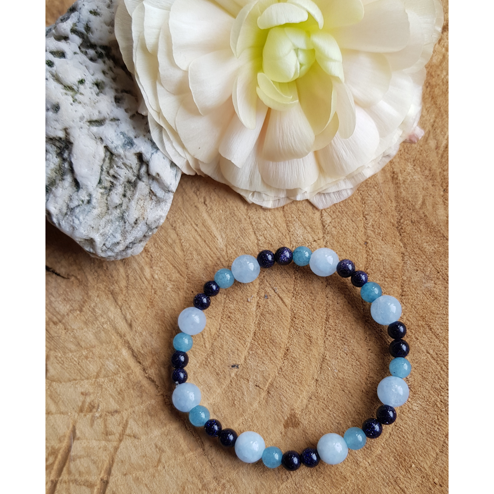Deze meisjes armband bestaat uit verschillende blauwe edelstenen: Aquamarijn, Chalcedoon en Zandsteen.