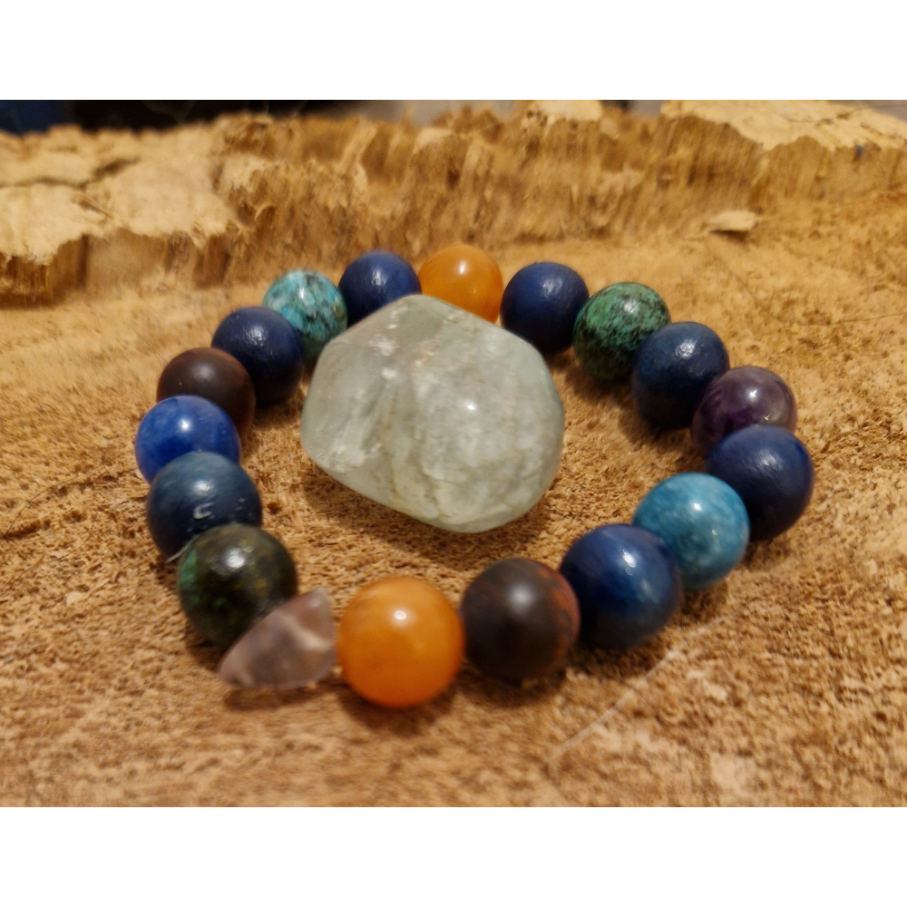 Deze stoere kralenarmband voor jongens bestaat uit 8mm edelstenen kralen. De edelstenen armband bestaat uit veel verschillende kleuren maar voornamelijk uit blauwe tinten en in combinatie met de oranje aventurijn kralen geeft dit een mooi contrast. De edelstenen jongens armband bestaat uit apatiet, amethist, afrikaans turkoois, tijgeroog, azuriet, fluoriet, kyaniet, aventurijn en uit blauwe houten kralen.